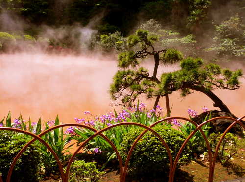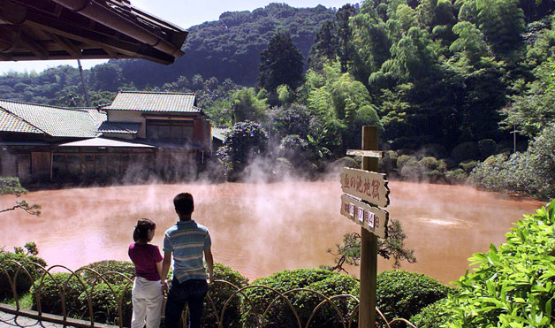 Blood Pond Hot Spring is one of the " hells" ( jigoku ) of Beppu, Japan, nine spectacular natural hot springs that are more for viewing rather than bathing. The “ blood pond hell ” features a pond of hot, red water, colored as such by iron in the waters.