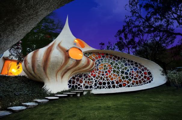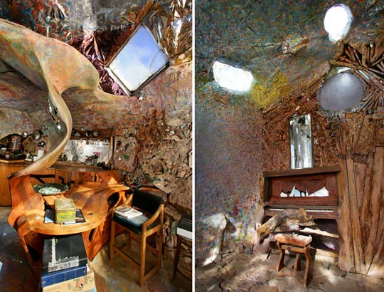 Called the ‘Eliphante house’ for the look of its entrance, this sculptural home was created by artist Michael Kahn and his wife Leda Livant with found materials over a period of 28 years.