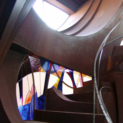 Brown’s architectural style developed when he began experimenting with materials like wood, colored glass, shell, ceramics and various metals to create irregular shapes that mimic those found in nature.
